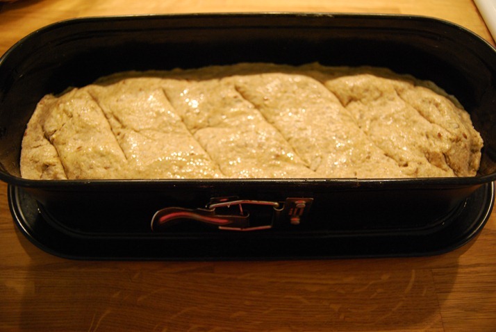 --7-- Oliamo una teglia (noi usiamo uno stampo da plumcake) e mettiamoci il nostro impasto. Facciamo i canonici tagli (che non ho mai capito bene a che servono, ma credo abbiamo a che fare con la lievitazione…) e volendo con un pennello ungiamo anche la parte sopra del nostro pane. Copriamo col solito canovaccio e lasciamo a riposare un’altra oretta.